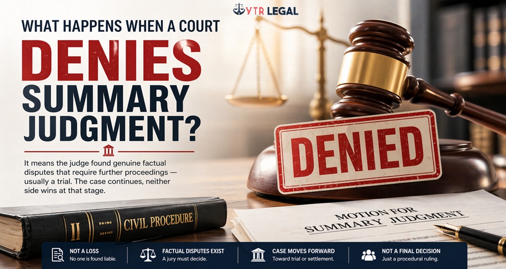 When a court denies summary judgment, it means the judge found genuine factual disputes that require further proceedings — usually a trial. The case continues, neither side wins at that stage, and the parties move toward trial, settlement negotiations, or additional pre-trial motions. It is not a loss on the merits.